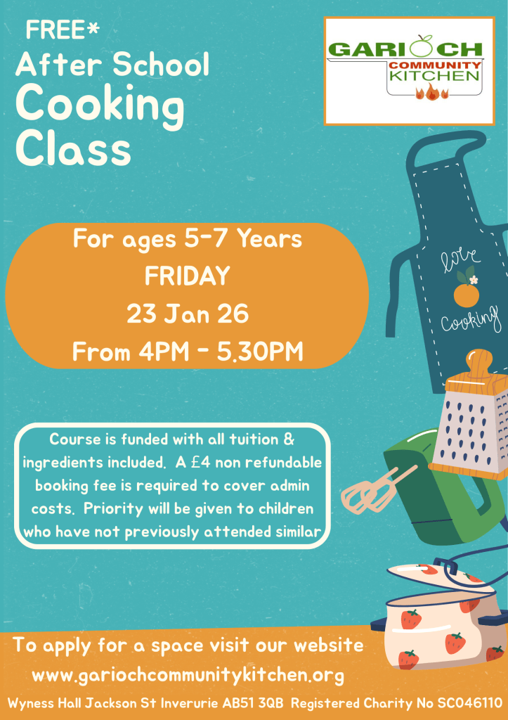 Would you like to get the children interested in cooking and help with meal times at home? Or perhaps want to expand what the children eat. Then why not book a space on our After School Cooking Classes on Friday 23 Jan from 4pm – 5.30pm. Children with make and take home a meal to share. To request a space on the class please complete the link below and I will get back to you shortly, please note spaces will be prioritised to children and families who have not previously attended a class. Keep an eye on your junk folder for emails from gariochcommunitykitchen@gmail.com