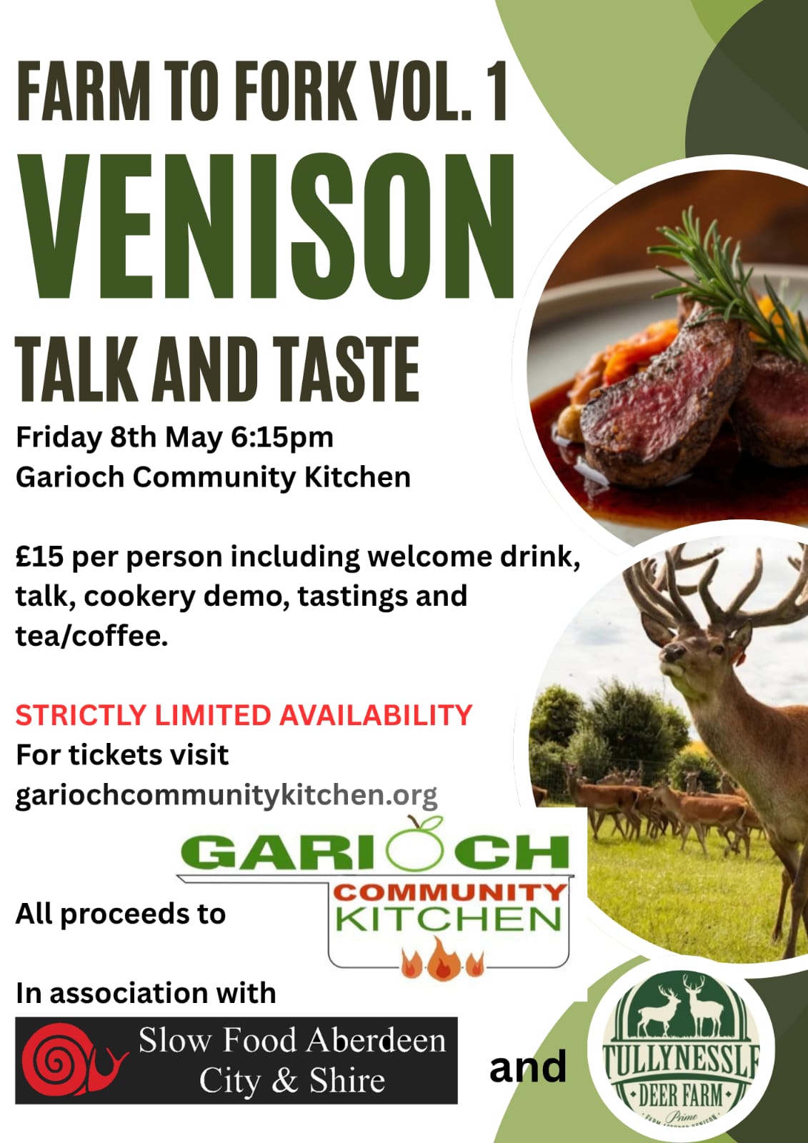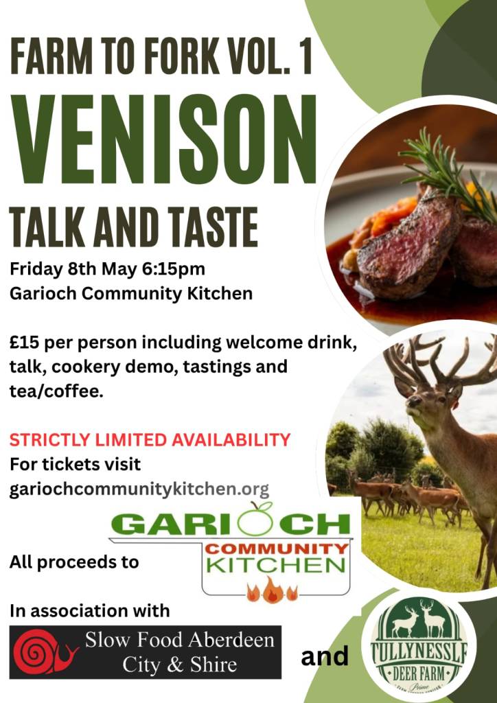 Come on a red deer journey from Farm to Fork hosted by Janet Keith from Tullynessle Deer Farm and Chef Lesley Gillespie. We will talk you through the deer farming cycle, the benefits of eating venison, not only for the sustainability and environment but also how venison sits at the top of the table nutritionally above all other meats we eat in Scotland. We will chat about the various cuts from the animal and how to best cook them. Finally, you will be able to sample and taste the various Venison dishes cooked from the farm with refreshments. Tickets priced £15, please complete information in the link below to request tickets.